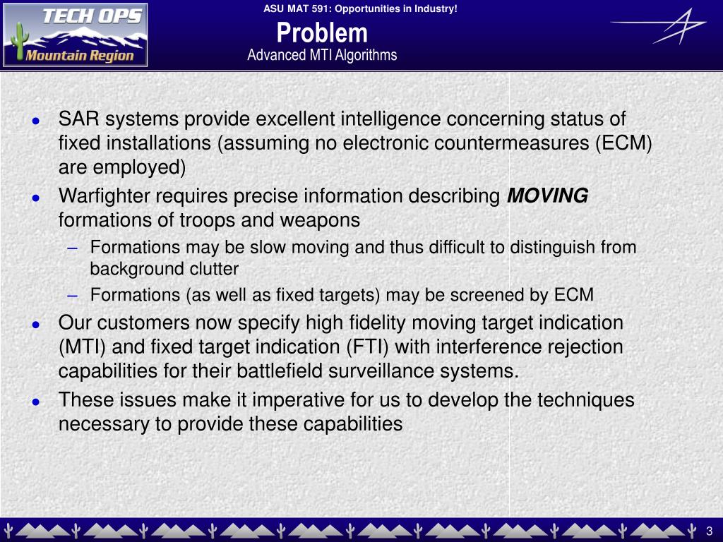 ProblemAdvanced MTI Algorithms • SAR systems provide excellent intelligence concerning status of fixed installations (assuming no electronic countermeasures (ECM) are employed) • Warfighter requires precise information describing MOVING formations of troops and weapons • Formations may be slow moving and thus difficult to distinguish from background clutter • Formations (as well as fixed targets) may be screened by ECM • Our customers now specify high fidelity moving target indication (MTI) and fixed target indication (FTI) with interference rejection capabilities for their battlefield surveillance systems. • These issues make it imperative for us to develop the techniques necessary to provide these capabilities