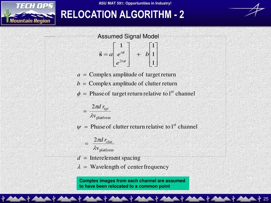 r r y ( e , s ) ( e , s ) $ $ = @ 1 1 1 Tgt r r y ( e , s ) ( e , s ) $ $ = @ 2 2 2 Tgt = e First ei genvector orthoganal to clutte r directio n $ 1 = e Second e igenvector orthogana l to clutt er directi on $ 2 Same eigen vectors co mputed dur ing interf erence sup pression and detect ion proces sing RELOCATION ALGORITHM Phase of target vector can now be found by solving for roots of quadratic Solution which provides largest return after beamforming is assumed correct
