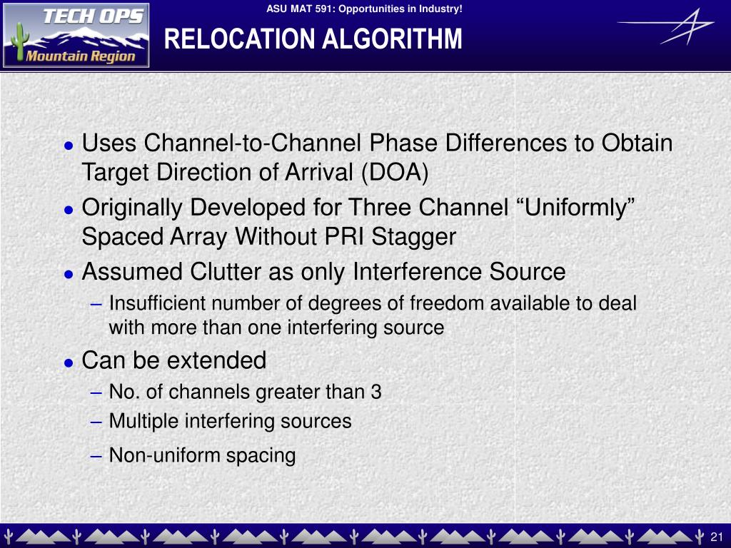 RELOCATION ALGORITHM • Uses Channel-to-Channel Phase Differences to Obtain Target Direction of Arrival (DOA) • Originally Developed for Three Channel “Uniformly” Spaced Array Without PRI Stagger • Assumed Clutter as only Interference Source • Insufficient number of degrees of freedom available to deal with more than one interfering source • Can be extended • No. of channels greater than 3 • Multiple interfering sources • Non-uniform spacing