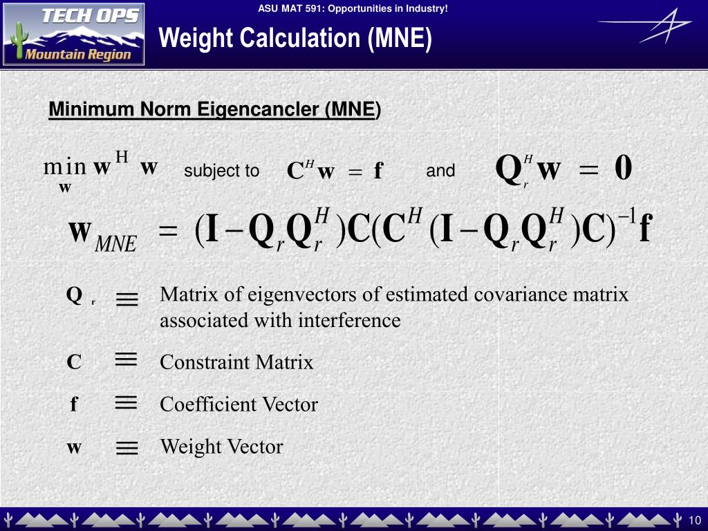 subject to and Matrix of eigenvectors of estimated covariance matrix associated with interference Q r C Constraint Matrix f Coefficient Vector w Weight Vector Weight Calculation (MNE) Minimum Norm Eigencancler (MNE)