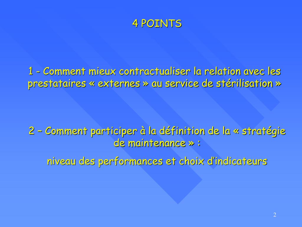 4 POINTS 1 - Comment mieux contractualiser la relation avec les prestataires « externes » au service de stérilisation » 2 – Comment participer à la définition de la « stratégie de maintenance » : niveau des performances et choix d’indicateurs