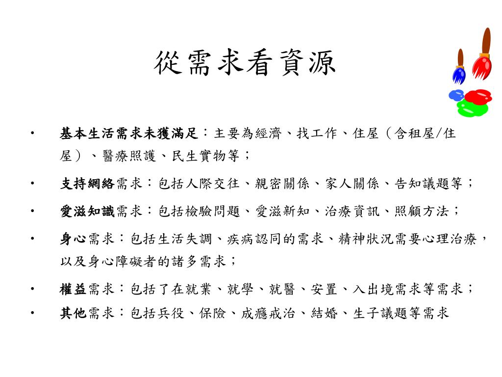從需求看資源 • 基本生活需求未獲滿足:主要為經濟、找工作、住屋(含租屋/住屋)、醫療照護、民生實物等; • 支持網絡需求:包括人際交往、親密關係、家人關係、告知議題等; • 愛滋知識需求:包括檢驗問題、愛滋新知、治療資訊、照顧方法; • 身心需求:包括生活失調、疾病認同的需求、精神狀況需要心理治療,以及身心障礙者的諸多需求; • 權益需求:包括了在就業、就學、就醫、安置、入出境需求等需求; • 其他需求:包括兵役、保險、成癮戒治、結婚、生子議題等需求
