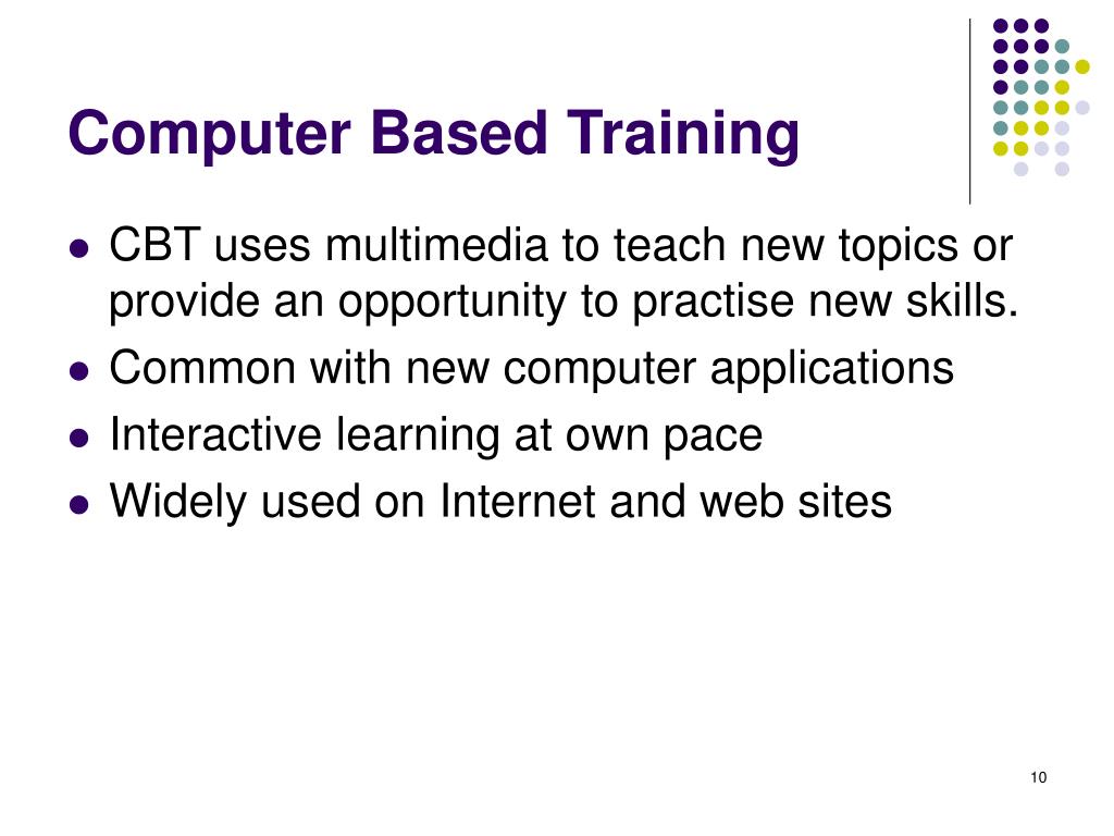 Computer Based Training • CBT uses multimedia to teach new topics or provide an opportunity to practise new skills. • Common with new computer applications • Interactive learning at own pace • Widely used on Internet and web sites
