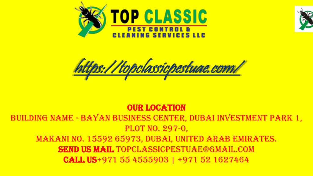 https://topclassicpestuae.com/ OUR LOCATION Building Name - Bayan Business Center, Dubai Investment Park 1, Plot No. 297-0,Makani No. 15592 65973, Dubai, United Arab Emirates. SEND US MAIL topclassicpestuae@gmail.com CALL US+971 55 4555903 | +971 52 1627464