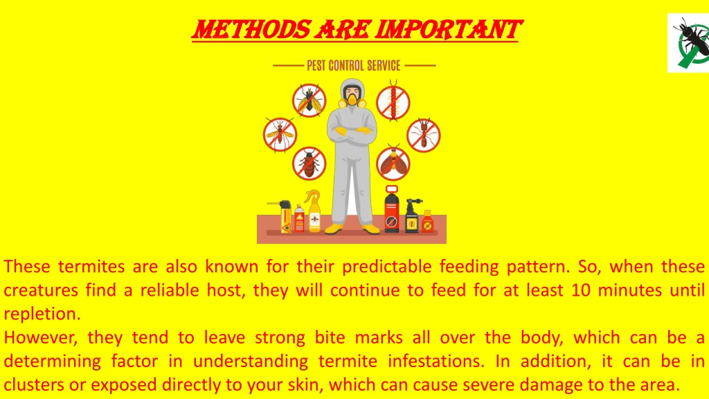 Methods Are Important These termites are also known for their predictable feeding pattern. So, when these creatures find a reliable host, they will continue to feed for at least 10 minutes until repletion. However, they tend to leave strong bite marks all over the body, which can be a determining factor in understanding termite infestations. In addition, it can be in clusters or exposed directly to your skin, which can cause severe damage to the area.