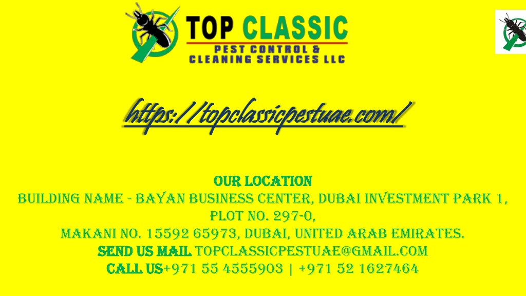 https://topclassicpestuae.com/ OUR LOCATION Building Name - Bayan Business Center, Dubai Investment Park 1, Plot No. 297-0,Makani No. 15592 65973, Dubai, United Arab Emirates. SEND US MAIL topclassicpestuae@gmail.com CALL US+971 55 4555903 | +971 52 1627464