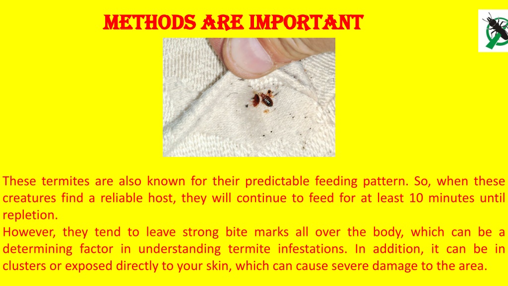 Methods Are Important These termites are also known for their predictable feeding pattern. So, when these creatures find a reliable host, they will continue to feed for at least 10 minutes until repletion. However, they tend to leave strong bite marks all over the body, which can be a determining factor in understanding termite infestations. In addition, it can be in clusters or exposed directly to your skin, which can cause severe damage to the area.