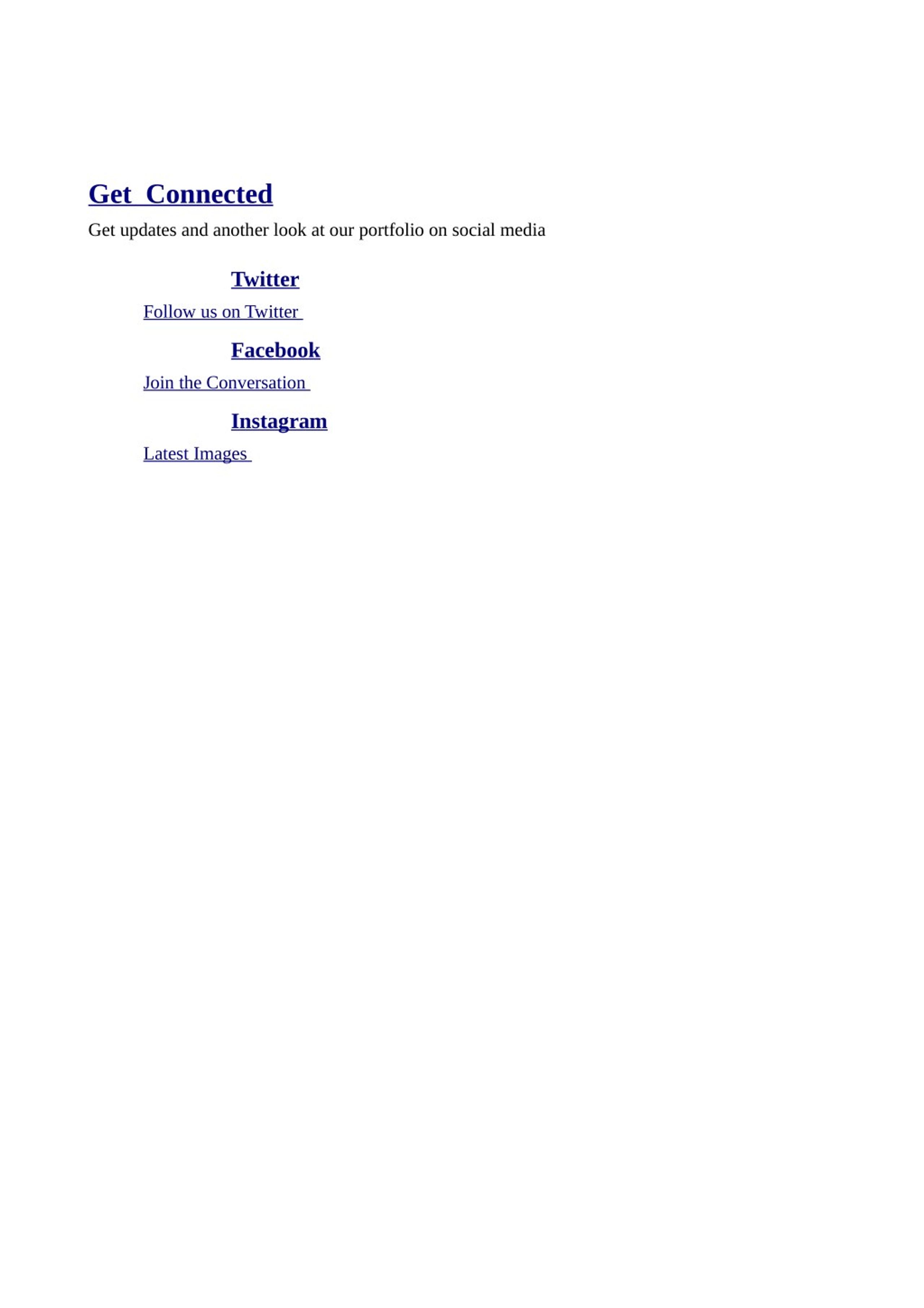 Get Connected Get updates and another look at our portfolio on social media Twitter Follow us on Twitter Facebook Join the Conversation Instagram Latest Images