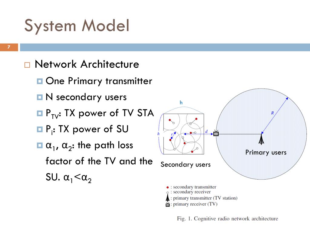 System Model • Network Architecture • One Primary transmitter • N secondary users • PTV: TX power of TV STA • Pi: TX power of SU • α1, α2: the path loss factor of the TV and the SU. α1<α2 h Primary users Secondary users