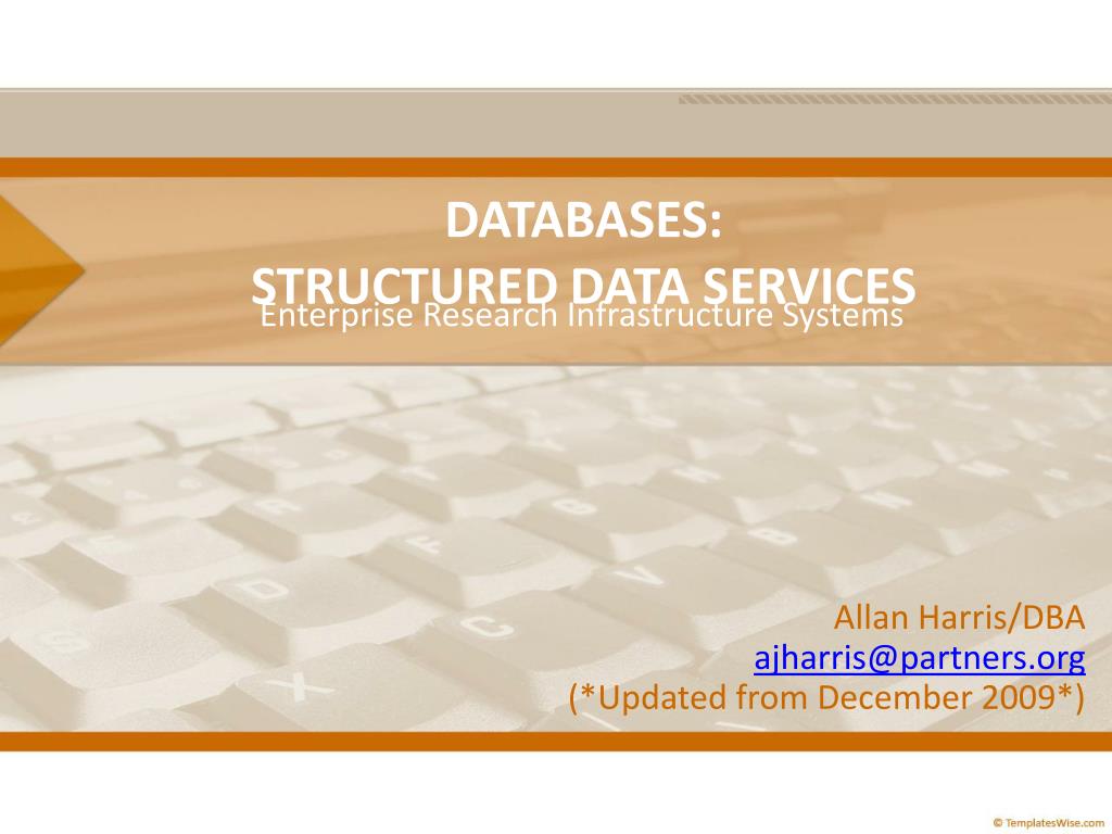 DATABASES: STRUCTUREDDATA SERVICES Enterprise Research Infrastructure Systems Allan Harris/DBA ajharris@partners.org (*Updated from December 2009*)