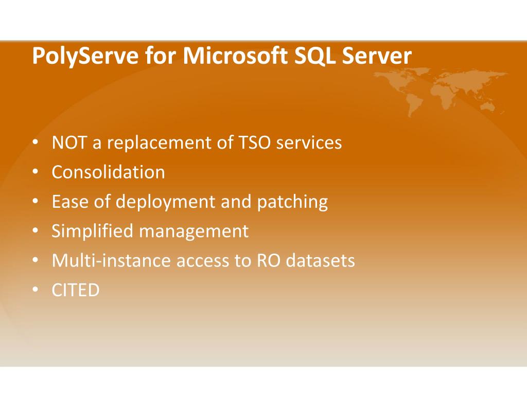 PolyServe for Microsoft SQL Server NOT a replacement of TSO services Consolidation Ease of deployment and patching Simplified management Multi-instance access to RO datasets CITED