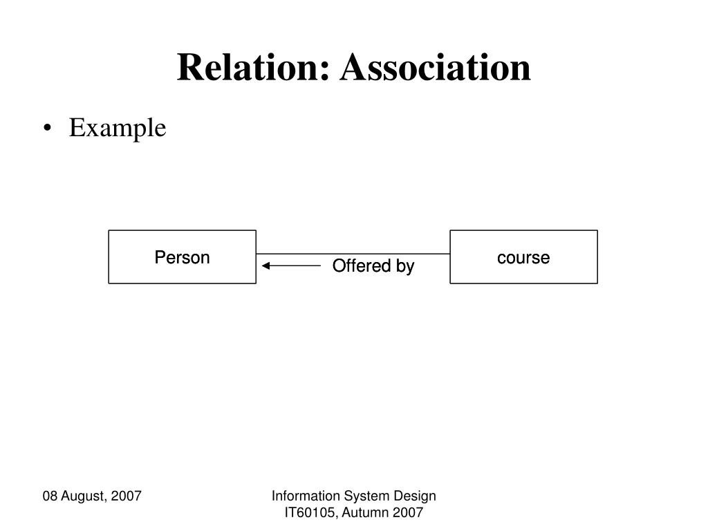 Relation: Association • Example Information System Design IT60105, Autumn 2007