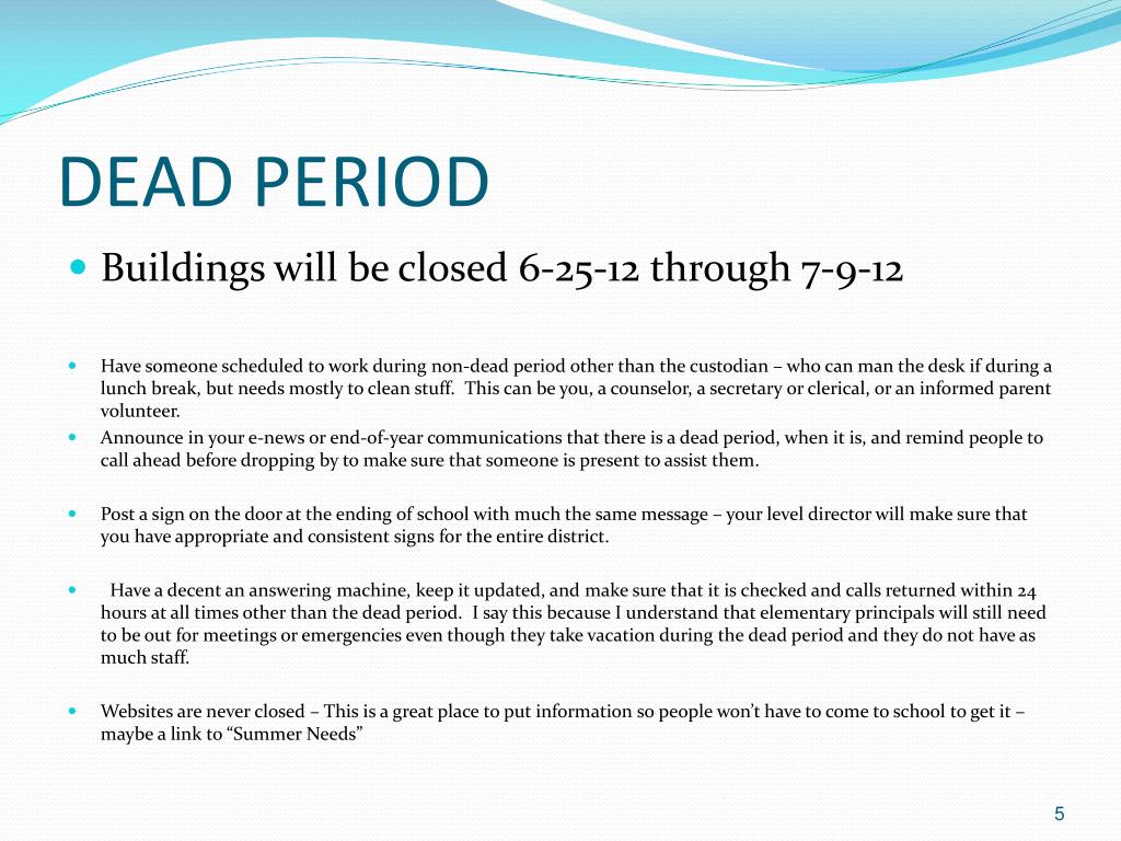 DEAD PERIOD • Buildings will be closed 6-25-12 through 7-9-12 • Have someone scheduled to work during non-dead period other than the custodian – who can man the desk if during a lunch break, but needs mostly to clean stuff. This can be you, a counselor, a secretary or clerical, or an informed parent volunteer. • Announce in your e-news or end-of-year communications that there is a dead period, when it is, and remind people to call ahead before dropping by to make sure that someone is present to assist them. • Post a sign on the door at the ending of school with much the same message – your level director will make sure that you have appropriate and consistent signs for the entire district. • Have a decent an answering machine, keep it updated, and make sure that it is checked and calls returned within 24 hours at all times other than the dead period. I say this because I understand that elementary principals will still need to be out for meetings or emergencies even though they take vacation during the dead period and they do not have as much staff. • Websites are never closed – This is a great place to put information so people won’t have to come to school to get it – maybe a link to “Summer Needs”