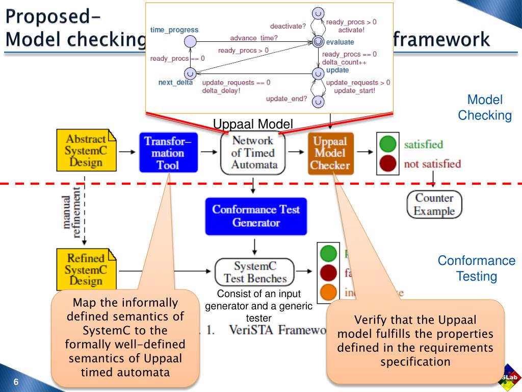 Proposed-Model checking and Conformance testing framework Model Checking Uppaal Model Conformance Testing Consist of an input generator and a generic tester Map the informally defined semantics of SystemC to the formally well-defined semantics of Uppaal timed automata Verify that the Uppaal model fulfills the properties defined in the requirements specification