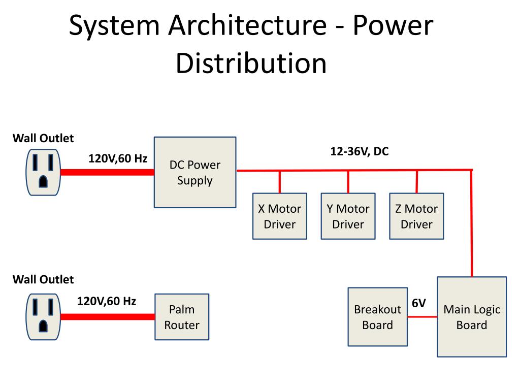 Power Distribution and Controls. System Architecture. System Architecture - Power Distribution. Wall Outlet. DC Power Supply. 12-36V, DC. 120V,60 Hz. X Motor Driver. Y Motor Driver. Z Motor Driver. Wall Outlet. Main Logic Board. 120V,60 Hz. Breakout Board. 6V. Palm Router.
