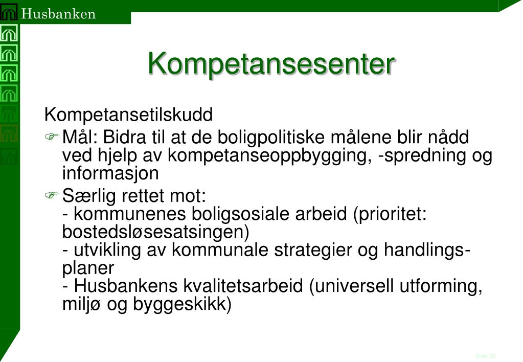 Kompetansesenter Kompetansetilskudd • Mål: Bidra til at de boligpolitiske målene blir nådd ved hjelp av kompetanseoppbygging, -spredning og informasjon • Særlig rettet mot: - kommunenes boligsosiale arbeid (prioritet: bostedsløsesatsingen)- utvikling av kommunale strategier og handlings-planer- Husbankens kvalitetsarbeid (universell utforming, miljø og byggeskikk)
