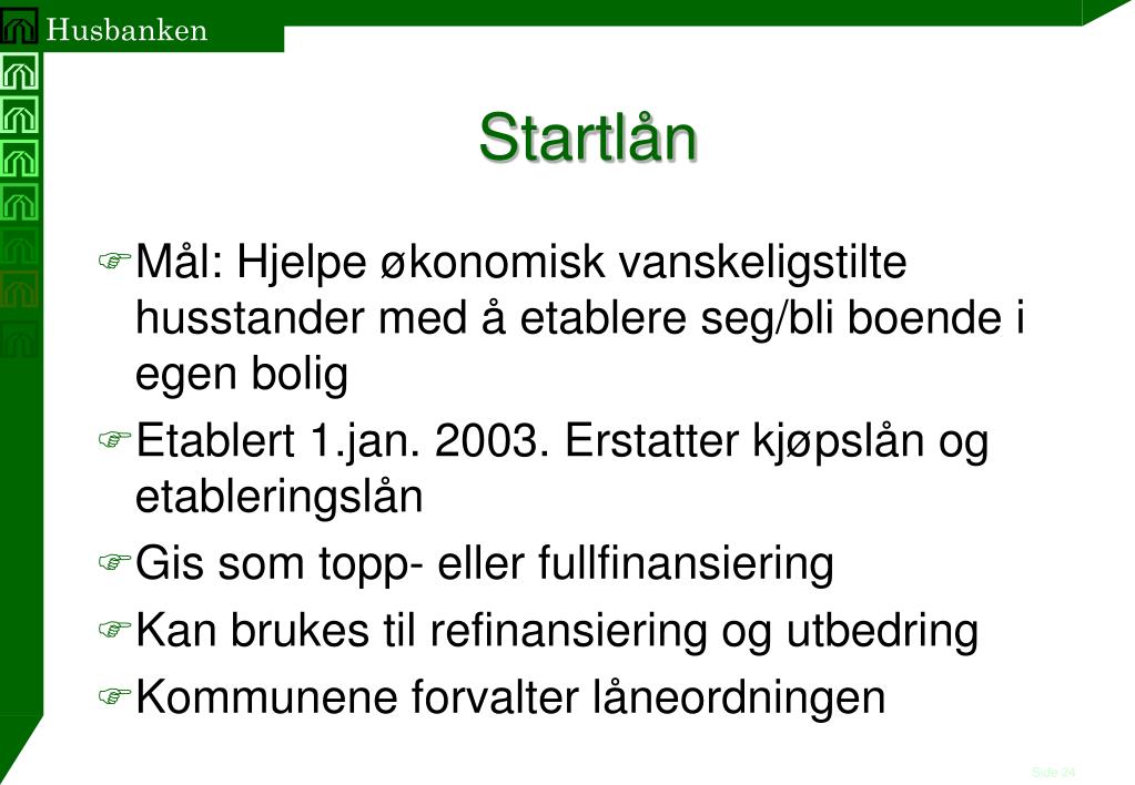 Startlån • Mål: Hjelpe økonomisk vanskeligstilte husstander med å etablere seg/bli boende i egen bolig • Etablert 1.jan. 2003. Erstatter kjøpslån og etableringslån • Gis som topp- eller fullfinansiering • Kan brukes til refinansiering og utbedring • Kommunene forvalter låneordningen