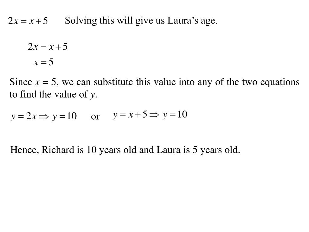 Solving this will give us Laura’s age. Since x = 5, we can substitute this value into any of the two equations to find the value of y. or Hence, Richard is 10 years old and Laura is 5 years old.