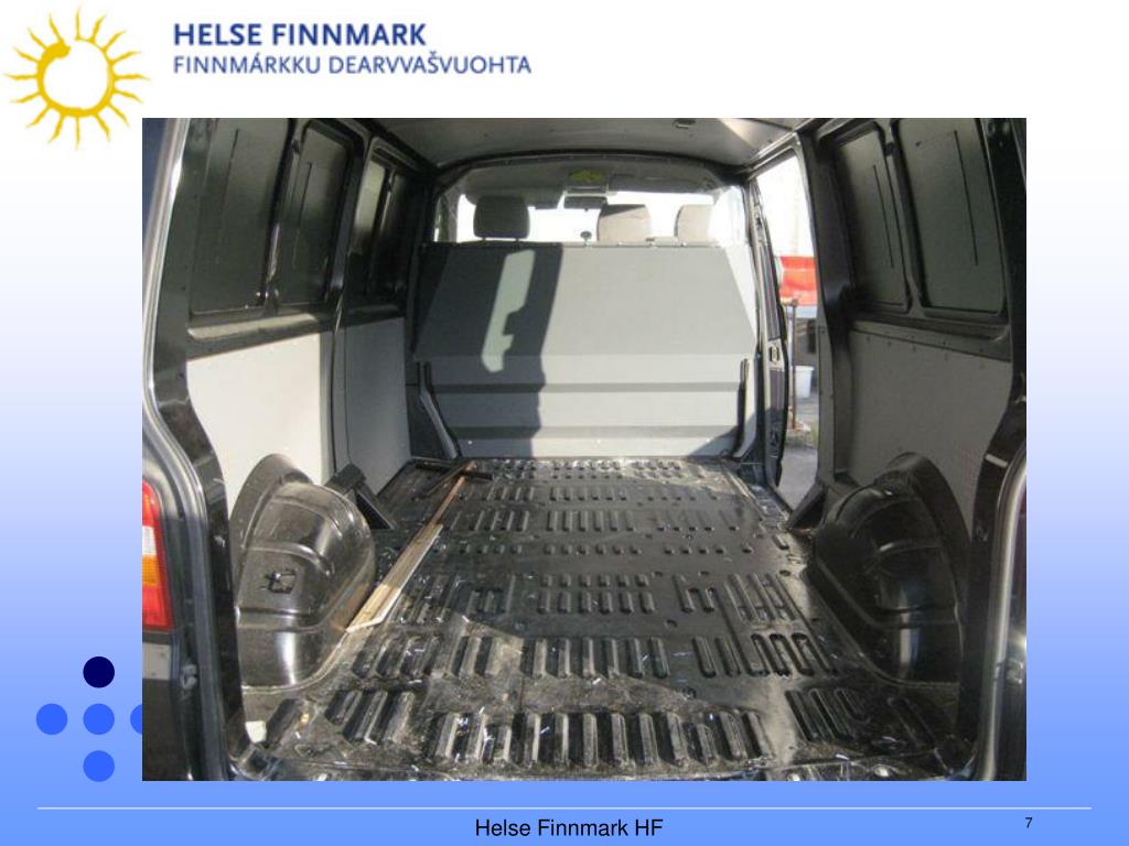 Bilens tilstand etter turen • Bilen desinfiseres av avfallselskapet i Senja før retur. • Alle dekkmatter i lasterom kasseres. • Bilen spyles og vaskes i Hammerfest uten at lukten forsvinner. • Blodvann har trekt seg fremover i førerdelen og gir ubehagelig lukt. • Lisingselskapet har levert inn skademelding til forsikringen. Helse Finnmark HF