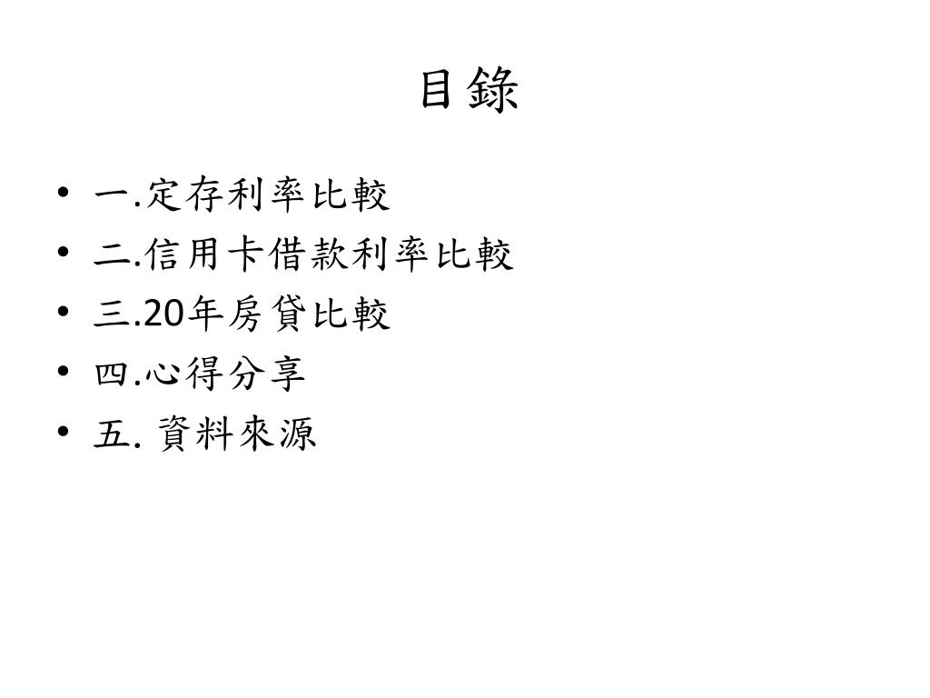 目錄 • 一.定存利率比較 • 二.信用卡借款利率比較 • 三.20年房貸比較 • 四.心得分享 • 五.資料來源