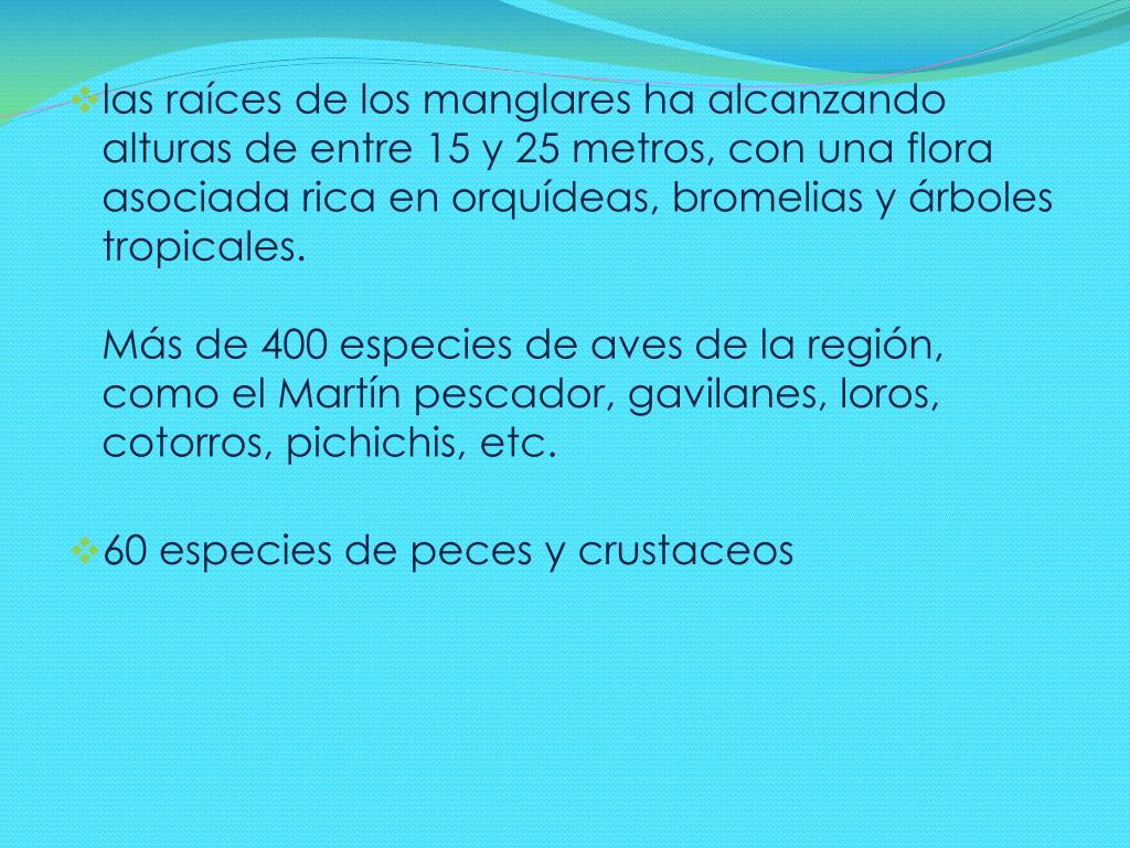 las raíces de los manglares ha alcanzando alturas de entre 15 y 25 metros, con una flora asociada rica en orquídeas, bromelias y árboles tropicales. Más de 400 especies de aves de la región, como el Martín pescador, gavilanes, loros, cotorros, pichichis, etc. • 60 especies de peces y crustaceos