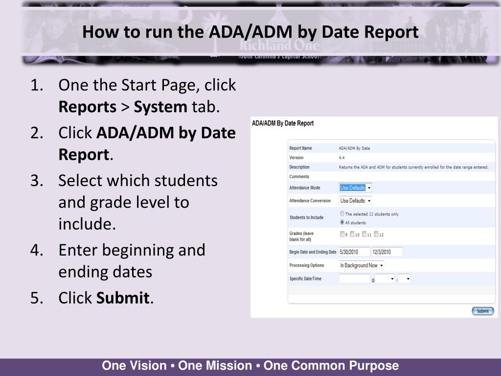 How to run the ADA/ADM by Date Report • One the Start Page, click Reports > System tab. • Click ADA/ADM by Date Report. • Select which students and grade level to include. • Enter beginning and ending dates • Click Submit.