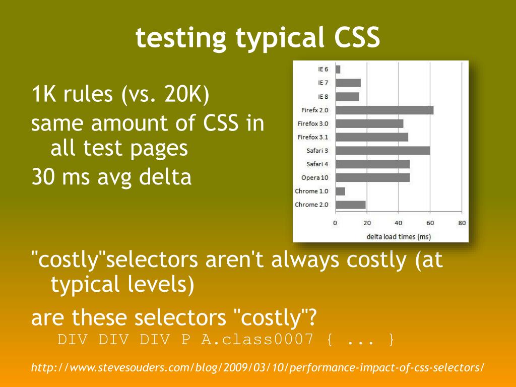 testing typical CSS 1K rules (vs. 20K) same amount of CSS in all test pages 30 ms avg delta • "costly"selectors aren't always costly (at typical levels) • are these selectors "costly"? • DIV DIVDIV P A.class0007 { ... } http://www.stevesouders.com/blog/2009/03/10/performance-impact-of-css-selectors/