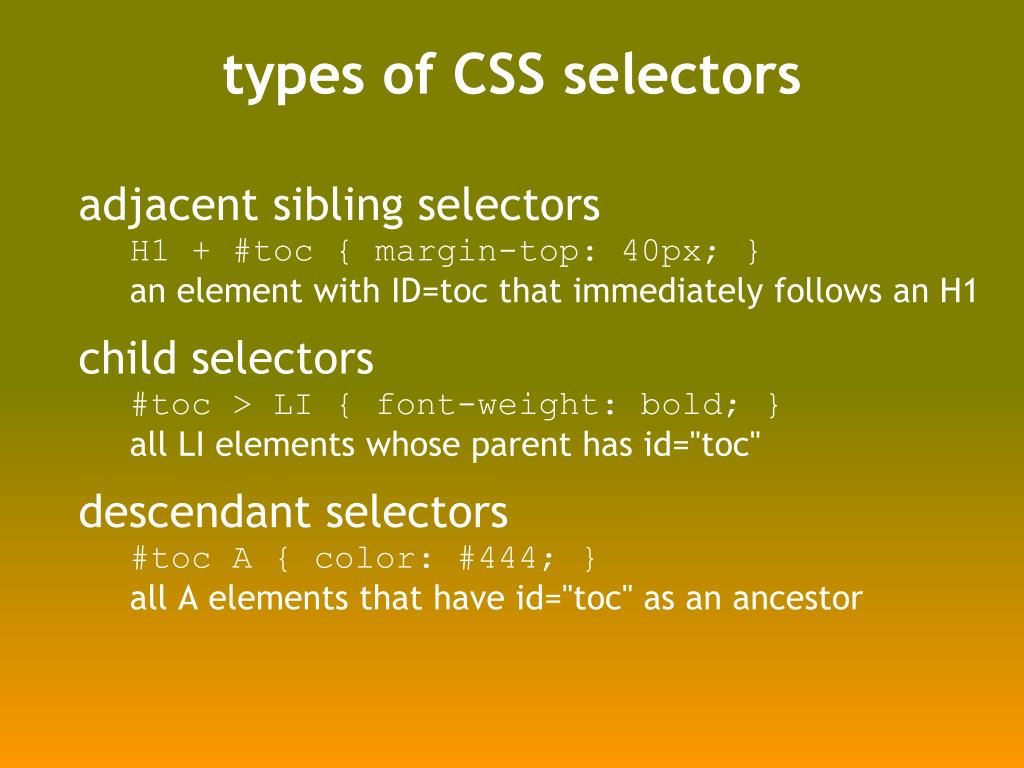 types of CSS selectors • adjacent sibling selectors • H1 + #toc { margin-top: 40px; } • an element with ID=toc that immediately follows an H1 • child selectors • #toc > LI { font-weight: bold; } • all LI elements whose parent has id="toc" • descendant selectors • #toc A { color: #444; } • all A elements that have id="toc" as an ancestor