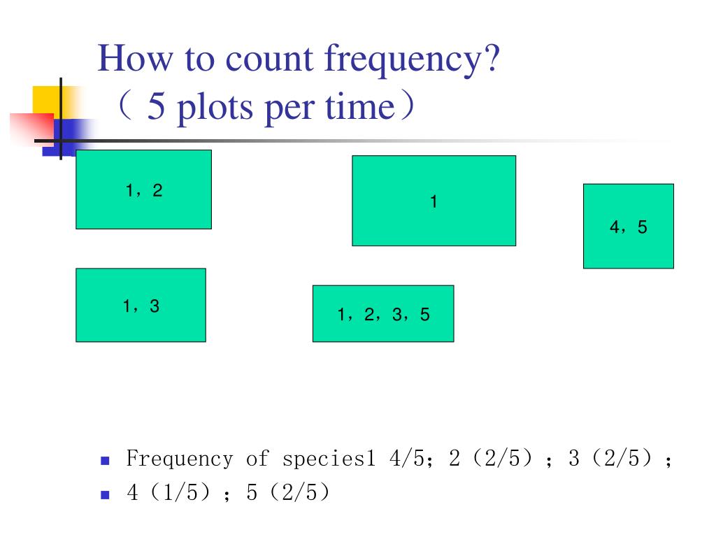 How to count frequency?( 5 plots per time) 1,2 1 • Frequency of species1 4/5;2(2/5);3(2/5); • 4(1/5);5(2/5) 4,5 1,3 1,2,3,5