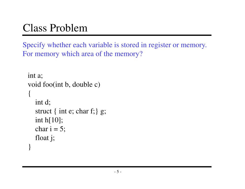 Class Problem Specify whether each variable is stored in register or memory. For memory which area of the memory? int a; void foo(int b, double c) { int d; struct { int e; char f;} g; int h[10]; char i = 5; float j; }