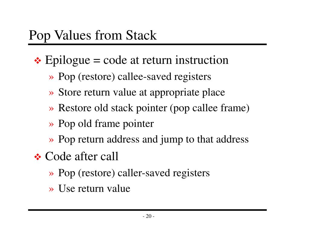 Pop Values from Stack • Epilogue = code at return instruction • Pop (restore) callee-saved registers • Store return value at appropriate place • Restore old stack pointer (pop callee frame) • Pop old frame pointer • Pop return address and jump to that address • Code after call • Pop (restore) caller-saved registers • Use return value