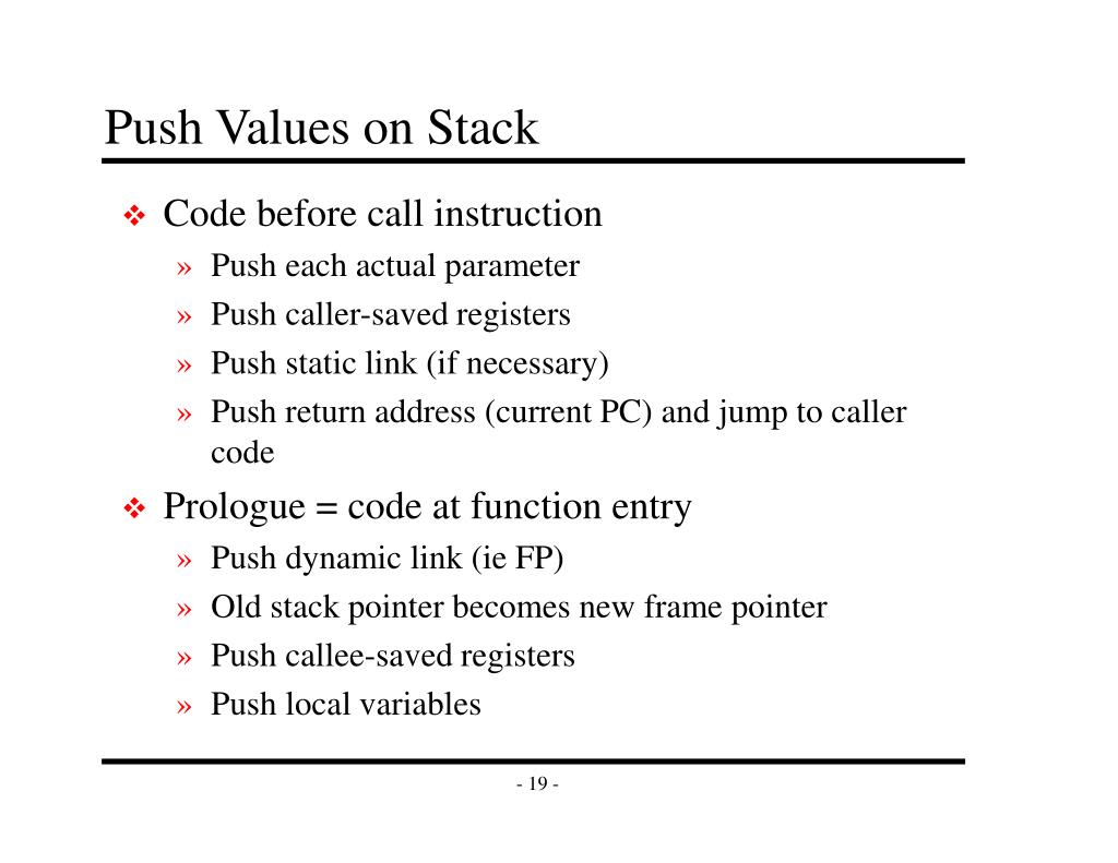 Push Values on Stack • Code before call instruction • Push each actual parameter • Push caller-saved registers • Push static link (if necessary) • Push return address (current PC) and jump to caller code • Prologue = code at function entry • Push dynamic link (ie FP) • Old stack pointer becomes new frame pointer • Push callee-saved registers • Push local variables