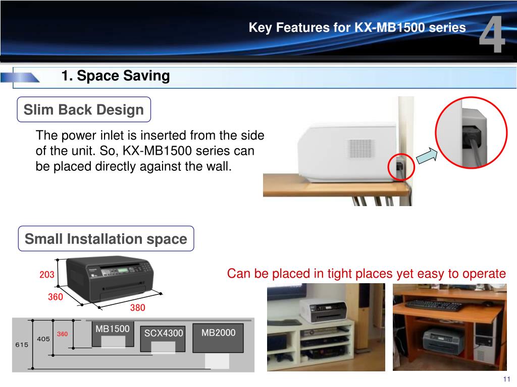 203 360 380 MB1500 360 MB2000 SCX4300 405 615 4 Key Features for KX-MB1500 series 1. Space Saving Slim Back Design The power inlet is inserted from the side of the unit. So, KX-MB1500 series can be placed directly against the wall. Small Installation space Can be placed in tight places yet easy to operate