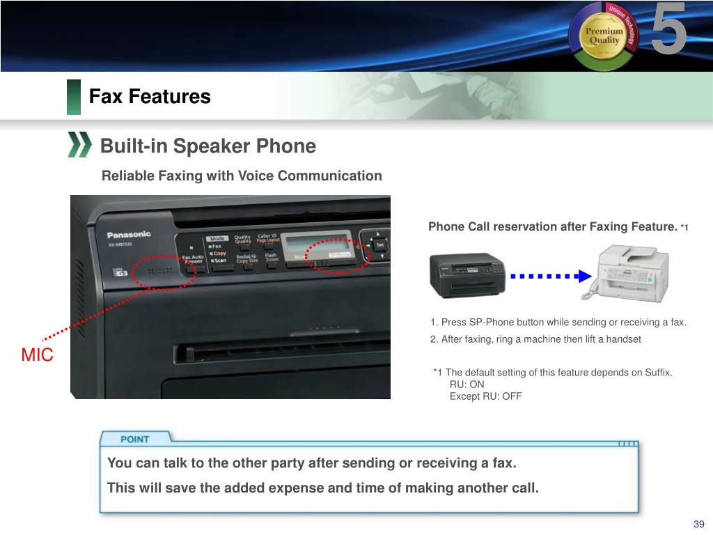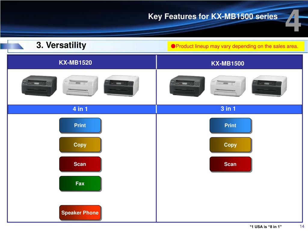 4 Key Features for KX-MB1500 series 3. Versatility ●Product lineup may vary depending on the sales area. KX-MB1520 KX-MB1500 3 in 1 4 in 1 Print Print Copy Copy Scan Scan Fax Speaker Phone *1 USA is “8 in 1”