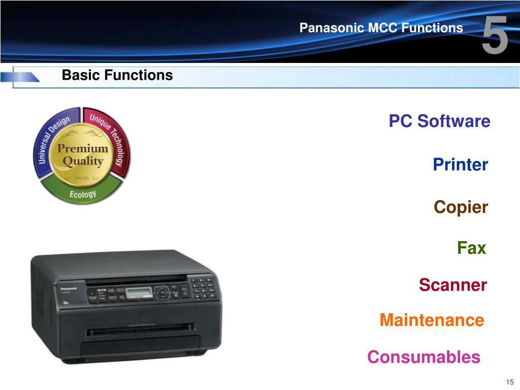 5 Panasonic MCC Functions Basic Functions PC Software Printer Copier Fax Scanner Maintenance Consumables