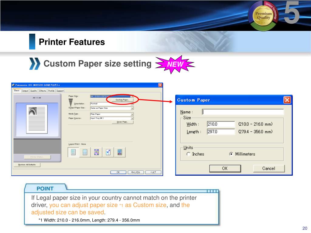 5 Printer Features NEW Custom Paper size setting If Legal paper size in your country cannot match on the printer driver, you can adjust paper size*1 as Custom size, and the adjusted size can be saved. *1 Width: 210.0 - 216.0mm, Length: 279.4 - 356.0mm