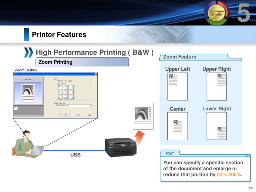 5 Printer Features High Performance Printing ( B&W ) Zoom Feature Zoom Printing Upper Left Upper Right Zoom Setting Lower Right Center USB You can specify a specific section of the document and enlarge or reduce that portion by 25%-400%.