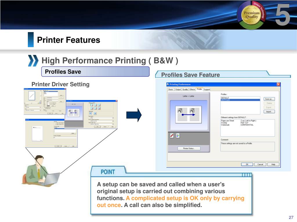 5 Printer Features High Performance Printing ( B&W ) Profiles Save Profiles Save Feature Printer Driver Setting A setup can be saved and called when a user's original setup is carried out combining various functions. A complicated setup is OK only by carrying out once. A call can also be simplified.