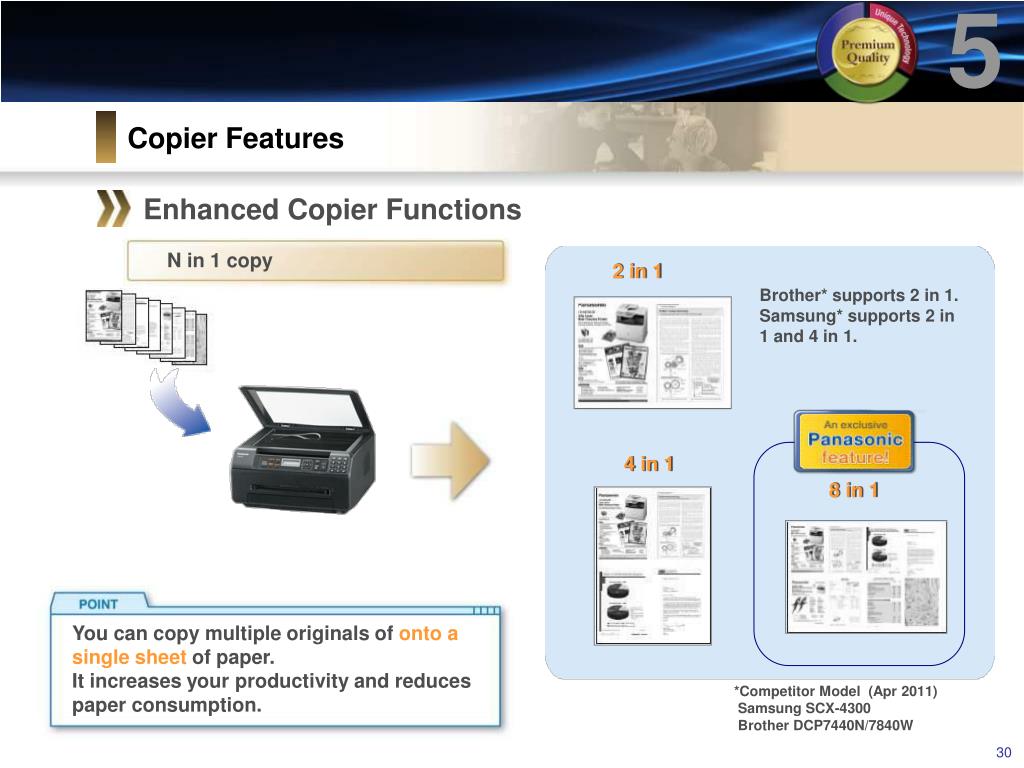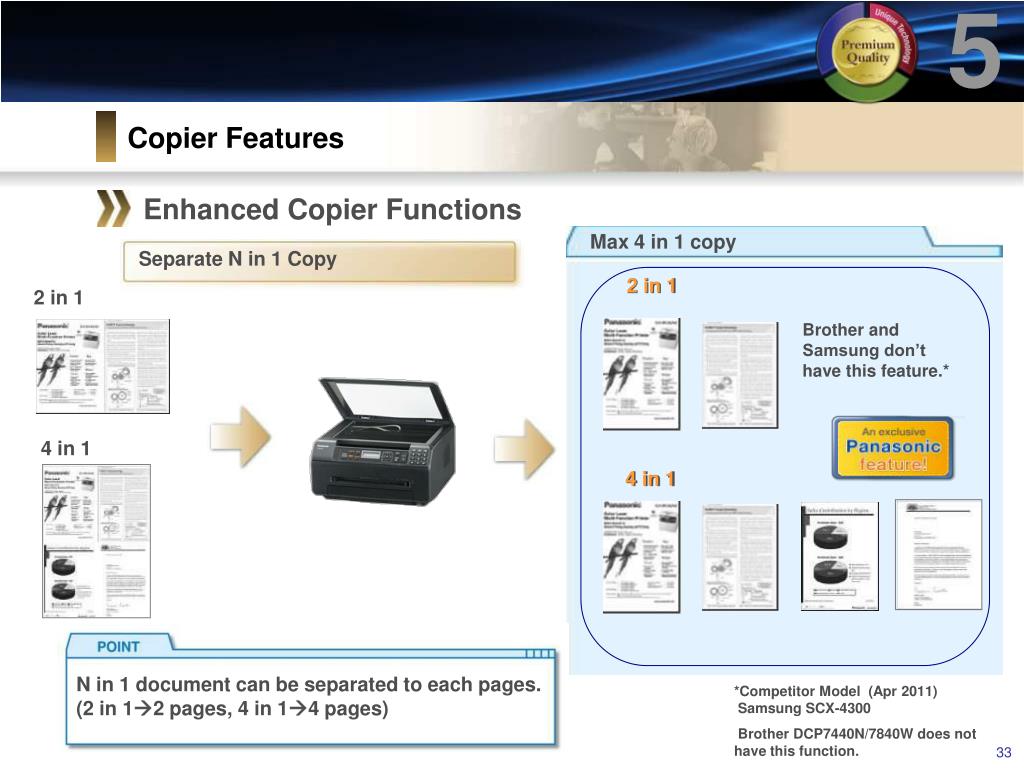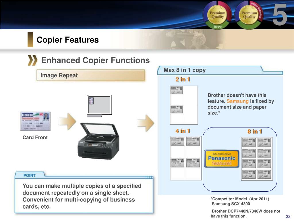 5 Copier Features Enhanced Copier Functions Max 8 in 1 copy Image Repeat 2 in 1 Brother doesn't have this feature. Samsung is fixed by document size and paper size.* 4 in 1 8 in 1 Card Front You can make multiple copies of a specified document repeatedly on a single sheet. Convenient for multi-copying of business cards, etc. *Competitor Model (Apr 2011) Samsung SCX-4300 Brother DCP7440N/7840W does not have this function.