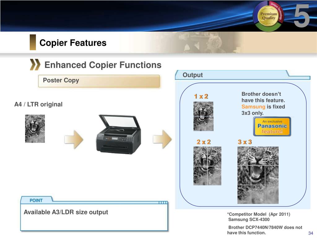 5 Copier Features Enhanced Copier Functions Output Edge / Margin Edge Brother and Samsung don’t have this feature. Original Margin No Print Area Easy filing *Competitor Model (Apr 2011) Samsung SCX-4300 Brother DCP7440N/7840W does not have this function.