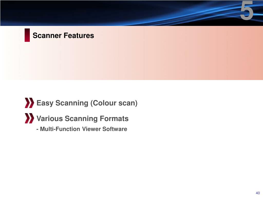 5 Scanner Features Easy Scanning (Colour scan) Various Scanning Formats - Multi-Function Viewer Software