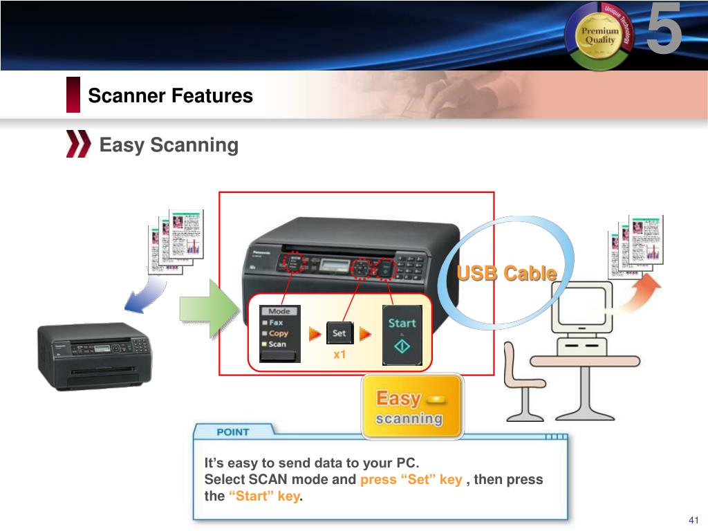 5 x1 Scanner Features Easy Scanning USB Cable *1 It’s easy to send data to your PC. Select SCAN mode and press “Set” key , then press the “Start” key.