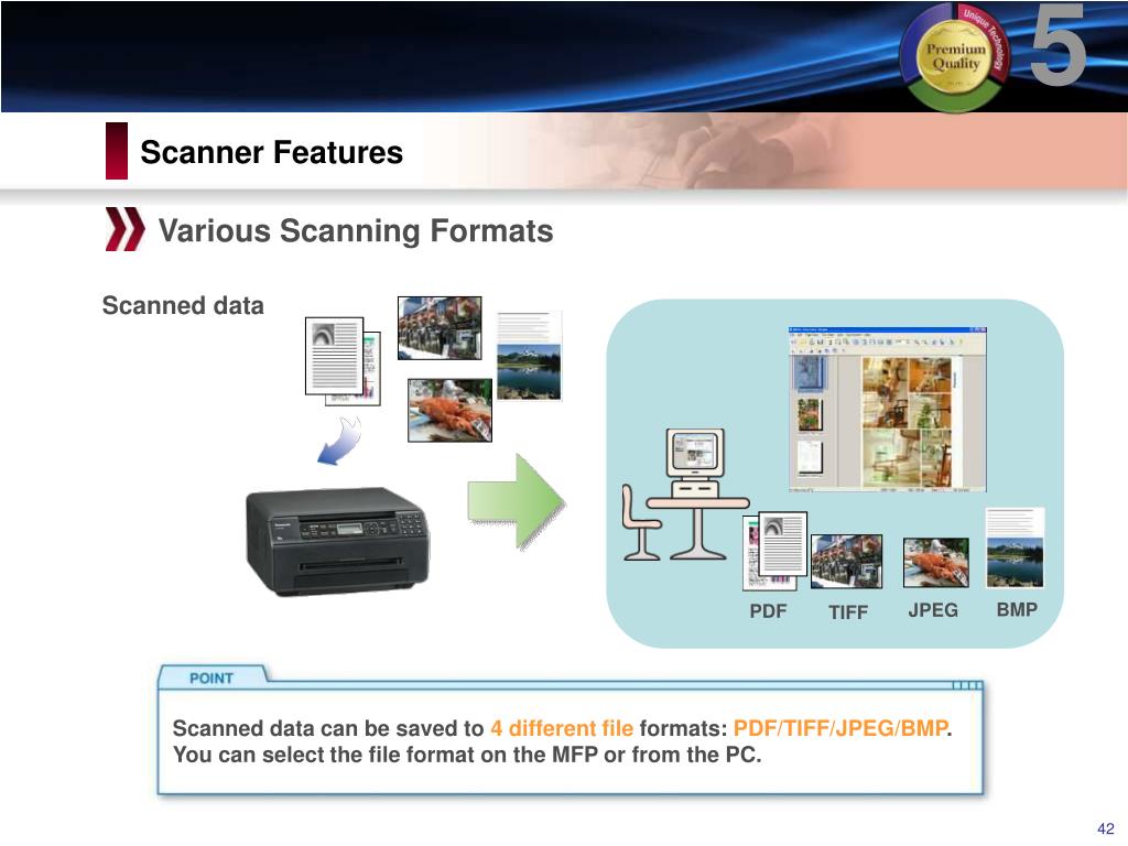 5 BMP JPEG PDF TIFF Scanner Features Various Scanning Formats Scanned data Scanned data can be saved to 4 different file formats: PDF/TIFF/JPEG/BMP. You can select the file format on the MFP or from the PC.