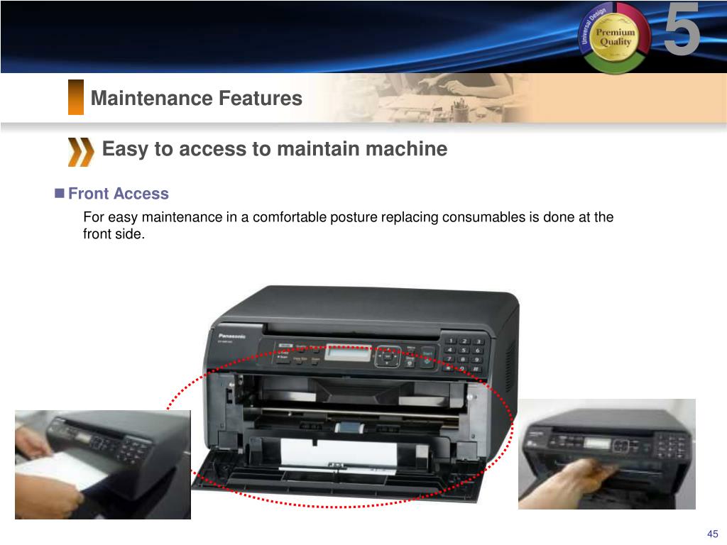 5 Maintenance Features Easy to access to maintain machine • Front Access For easy maintenance in a comfortable posture replacing consumables is done at the front side.