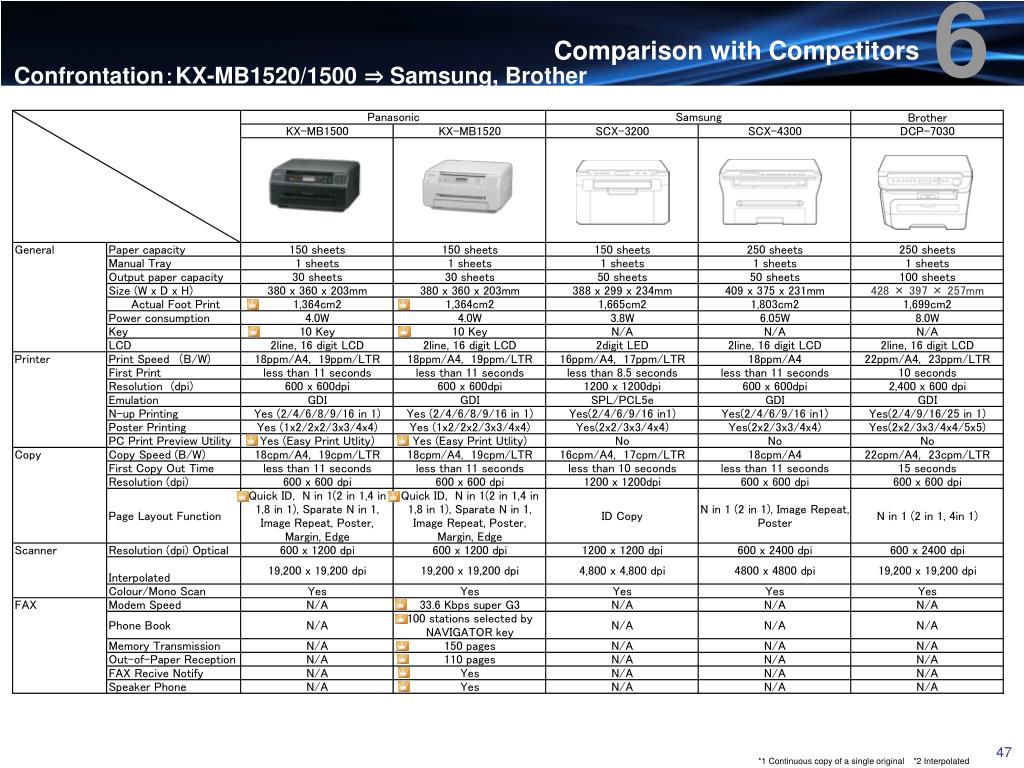 6 Comparison with Competitors Confrontation:KX-MB1520/1500 ⇒ Samsung, Brother *1 Continuous copy of a single original *2 Interpolated