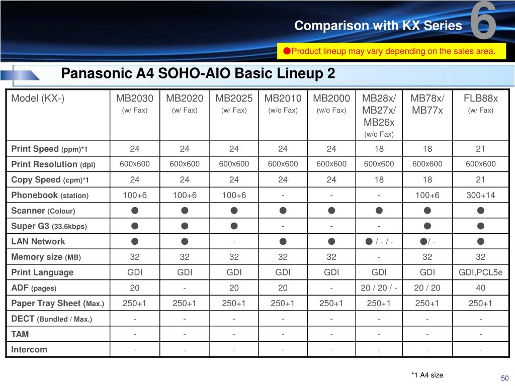 6 Comparison with KX Series ●Product lineup may vary depending on the sales area. Panasonic A4 SOHO-AIO Basic Lineup 2 *1 A4 size
