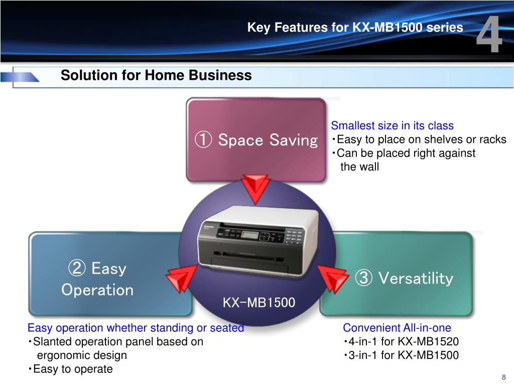 4 Key Features for KX-MB1500 series Solution for Home Business Smallest size in its class ・Easy to place on shelves or racks ・Can be placed right against the wall ① Space Saving ② Easy Operation ③ Versatility KX-MB1500 Easy operation whether standing or seated ・Slanted operation panel based on ergonomic design ・Easy to operate Convenient All-in-one ・4-in-1 for KX-MB1520 ・3-in-1 for KX-MB1500
