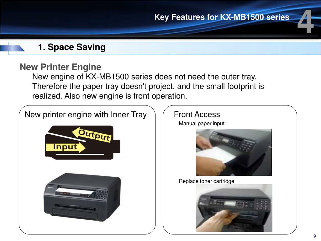4 Key Features for KX-MB1500 series 1. Space Saving New Printer Engine New engine of KX-MB1500 series does not need the outer tray. Therefore the paper tray doesn't project, and the small footprint is realized. Also new engine is front operation. Front Access New printer engine with Inner Tray Manual paper input Replace toner cartridge