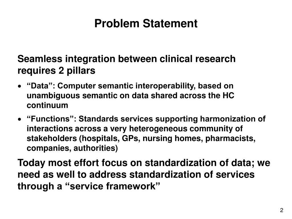Problem Statement • Seamless integration between clinical research requires 2 pillars • “Data”: Computer semantic interoperability, based on unambiguous semantic on data shared across the HC continuum • “Functions”: Standards services supporting harmonization of interactions across a very heterogeneous community of stakeholders (hospitals, GPs, nursing homes, pharmacists, companies, authorities) • Today most effort focus on standardization of data; we need as well to address standardization of services through a “service framework”