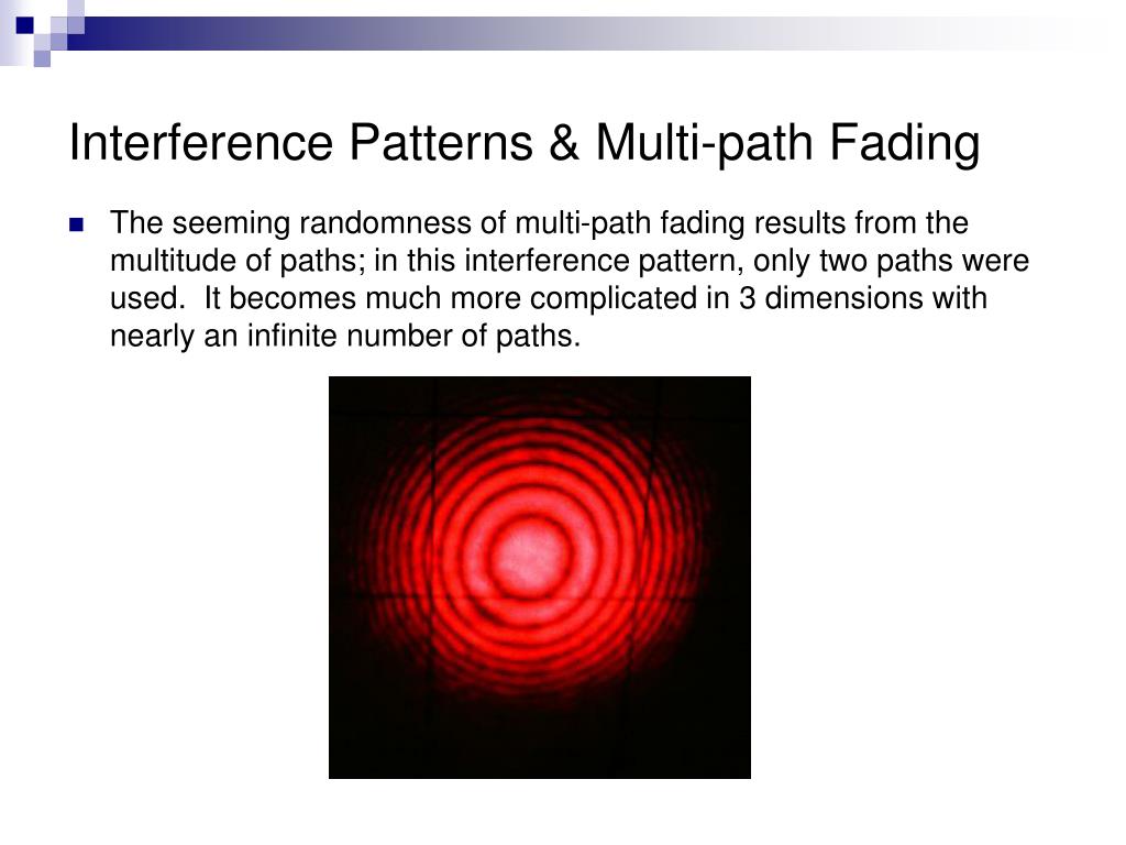 Interference Patterns & Multi-path Fading • The seeming randomness of multi-path fading results from the multitude of paths; in this interference pattern, only two paths were used. It becomes much more complicated in 3 dimensions with nearly an infinite number of paths.